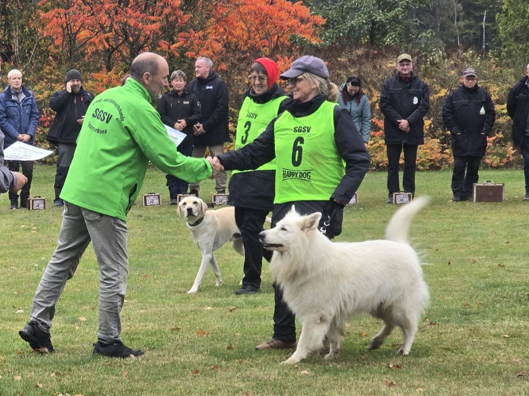 Den Teilnehmern bot sich ein Ackermischgelände, das mit Gräben durchzogen war. Das stellte an einige Hunde größere Anforderungen. Unser „Dreamteam in Weiß“ hatte damit offensichtlich keine Probleme. Der Lohn war das oberste Treppchen bei der Siegerehrung.